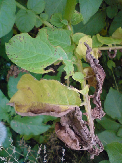 If you grow potatoes, they’ll almost certainly get blight at some point. The first sign is brown spots on the leaves, which may have yellow borders. This quickly spreads and withers all the leaves, until the plant looks quite dead.